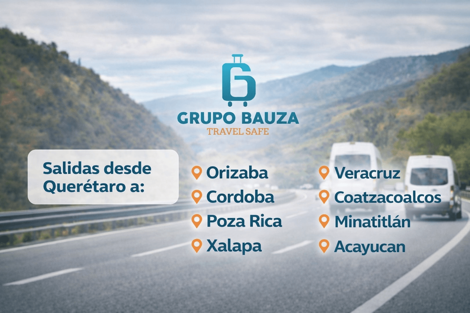Bienvenido a Grupo Bauza. Contamos con viajes a | Orizaba | Cordoba | Poza Rica | Xalapa | Veracruz | Coatzacoalcos | Minatitlan | Acayucan Planea tu viaje sencillo o redondo Viaja con la mejor calidad y seguridad Viajes a las mejores zonas de Veracruz Destinos Acayucan Coatzacoalcos Cordoba Minatitlan Orizaba Poza Rica Xalapa Horarios Poza Rica Veracruz Cordoba Orizaba Coatza – Mina – Acayucan Xalapa ¿Qué nos hace diferentes? Conexiones USB Carga tu dispositivo móvil durante tu viaje. Seguro de viajero Viaja tranquilo con nuestro seguro de viajero en todas tus rutas. Unidades Nuestras unidades son cómodas y equipadas para una mejor experiencia. Operadores Nuestros operadores están capacitados y certificados para nuestros servicios. Practicidad Reserva tu lugar con tarjeta de Crédito/Débito o transferencia. Selección de asiento Reserva tu lugar desde la comodidad de tu hogar.